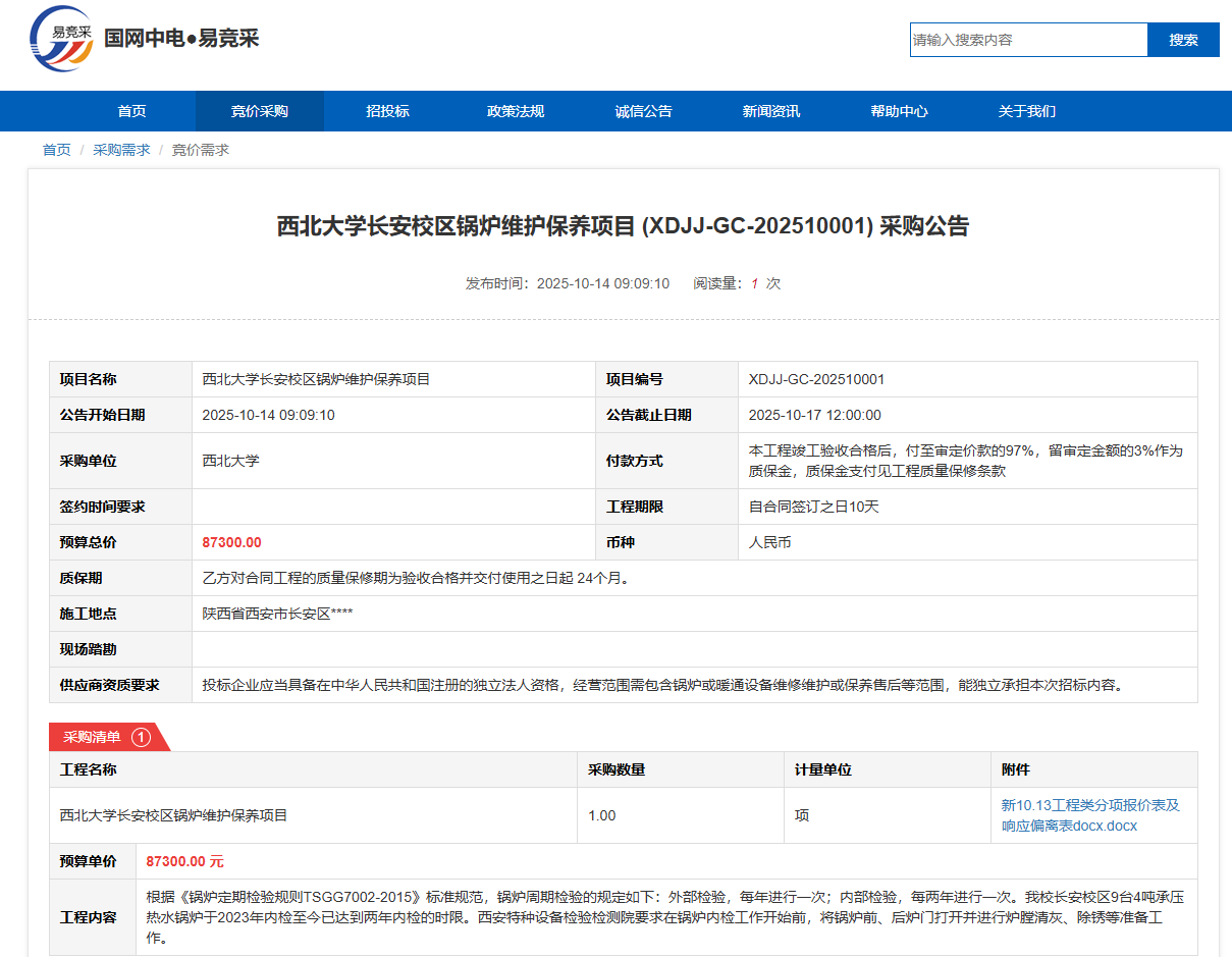 华体会正规平台长安校区锅炉维护保养项目(XDJJ-GC-202510001)竞价采购公告