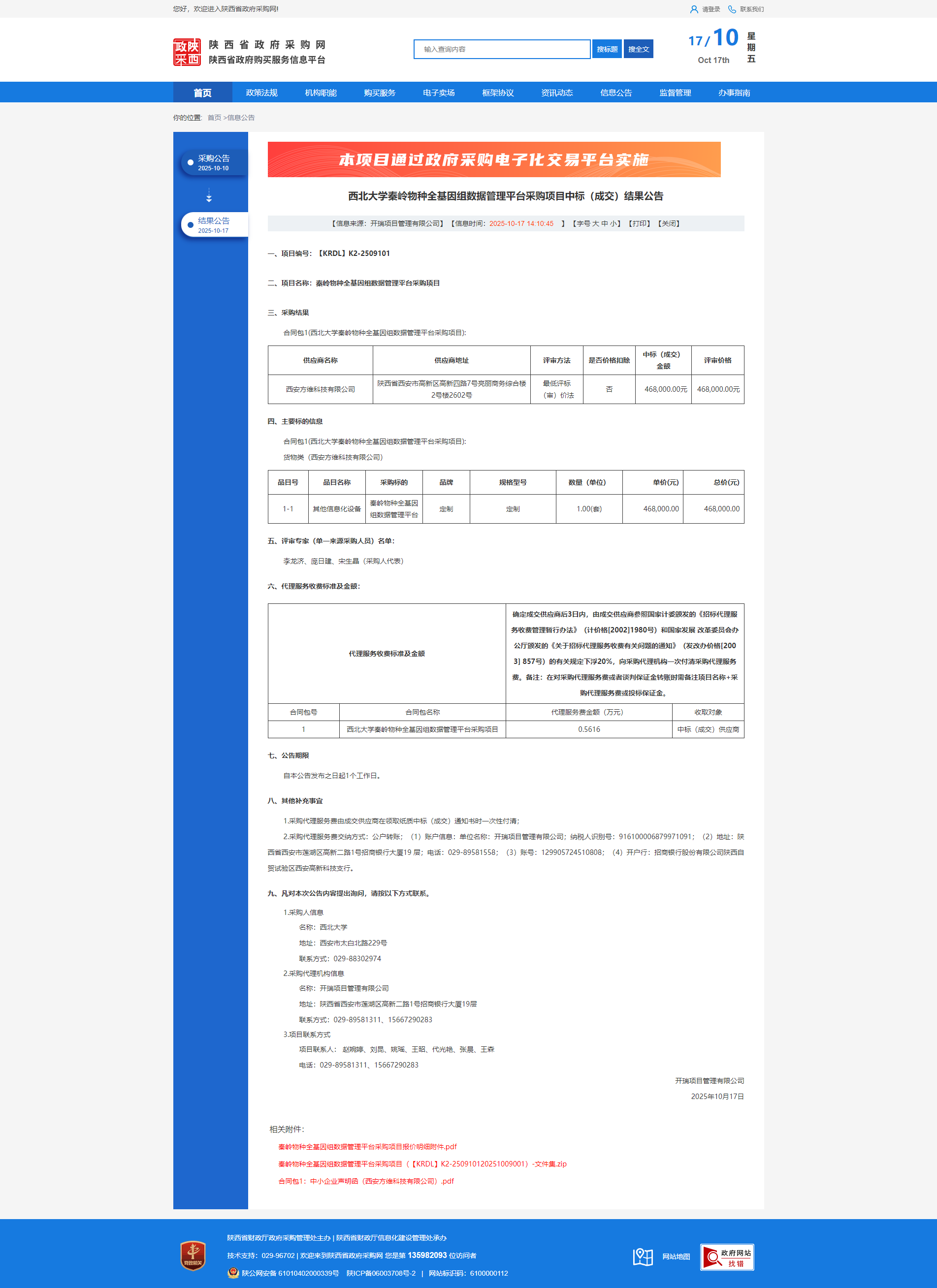 华体会正规平台秦岭物种全基因组数据管理平台采购项目中标(成交)结果公告